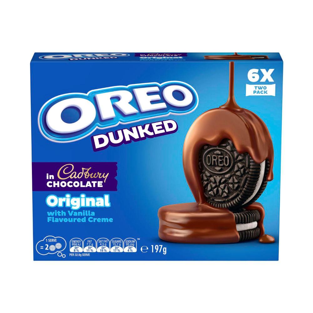 Oreo Original Cookies Dunked in Cadbury Chocolate take the classic sandwich cookie to a whole new level. Each Oreo features the iconic chocolate-flavored biscuit with vanilla creme, fully coated in smooth Cadbury milk chocolate for the ultimate mashup of crunch and creaminess.